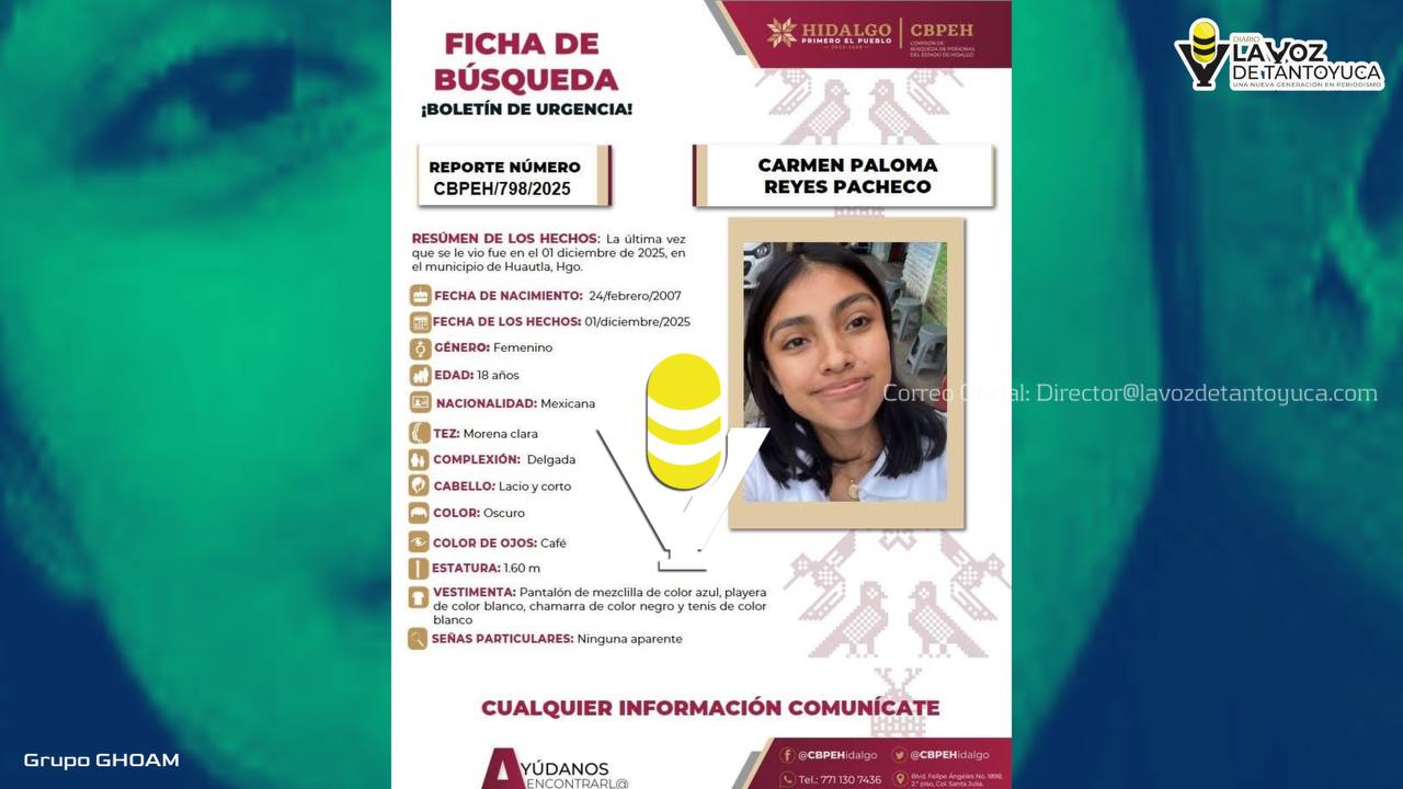La Comisión de Búsqueda de Personas del Estado de Hidalgo (CBPEH), solicita el apoyo de la población en general para localizar a la joven Carmen Paloma Reyes Pacheco, de 18 años de edad, quien se encuentra en calidad de desaparecida.