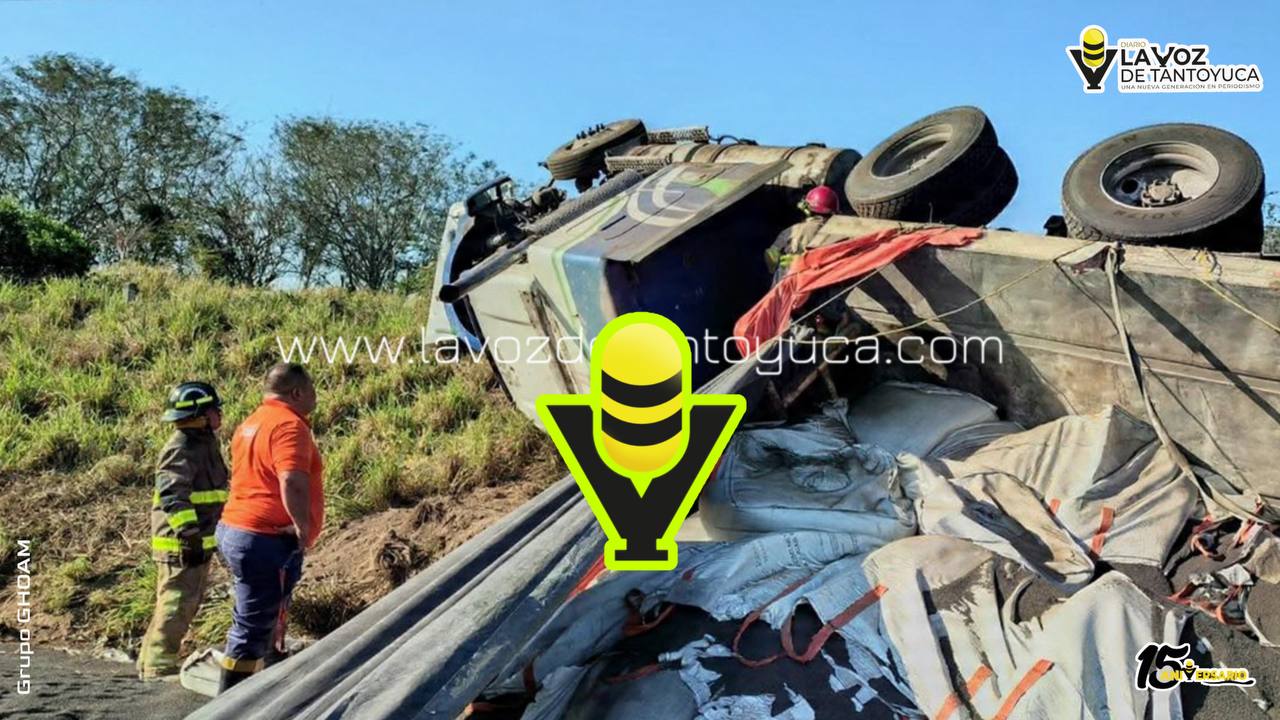 Un tráiler cargado con sacos de arena terminó volcado esta mañana de jueves sobre la autopista Cardel – Veracruz, presuntamente a causa de una falla mecánica.
