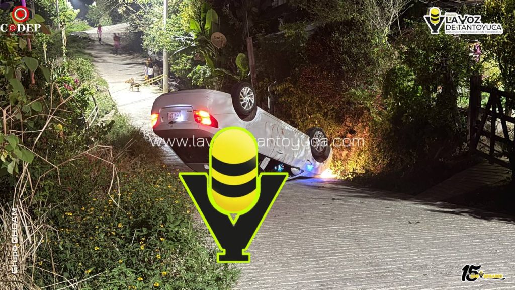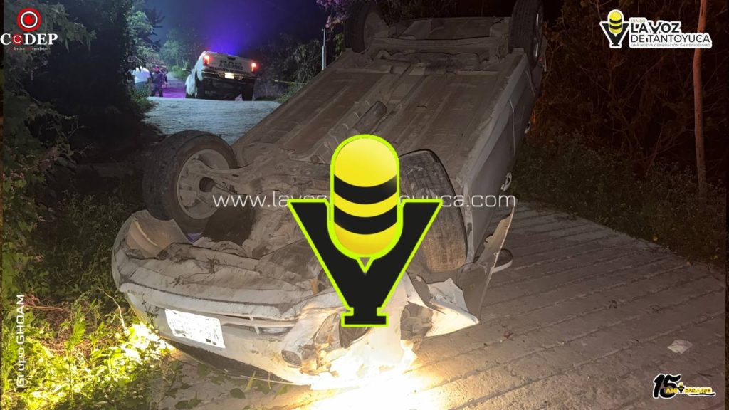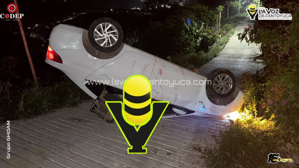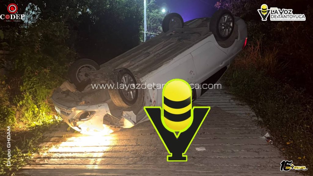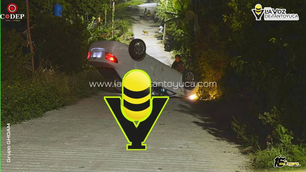 De acuerdo con versiones de vecinos, el conductor de un automóvil marca Chevrolet, tipo Aveo, color blanco, descendía una pendiente a presunto exceso de velocidad, lo que provocó que perdiera el control de la unidad y terminara volcando de manera aparatosa.