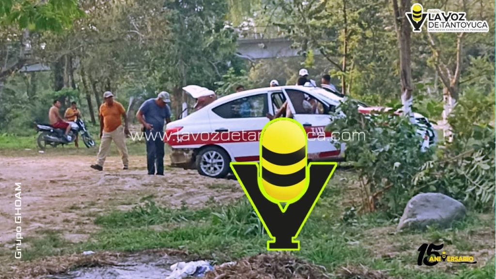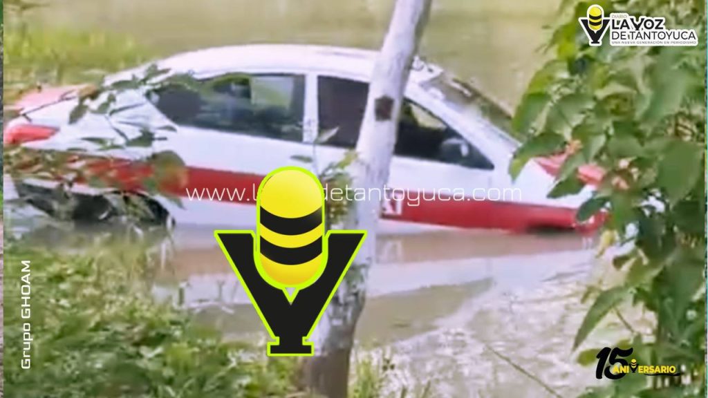Un taxi Nissan, Versa, marcado con el número económico 34, terminó completamente sumergido en el arroyo El Gavilán, a la altura del sitio conocido como El Puente.