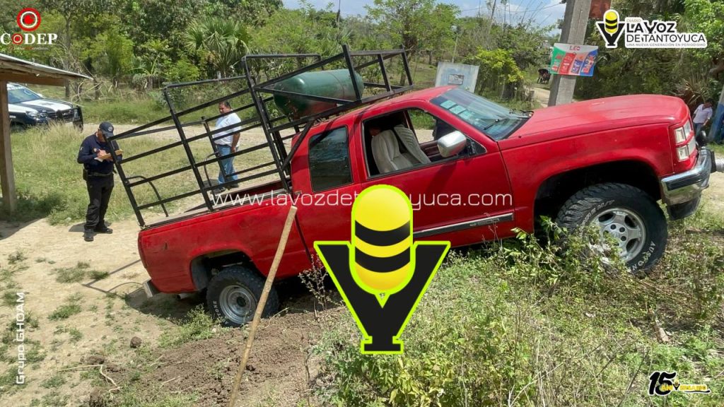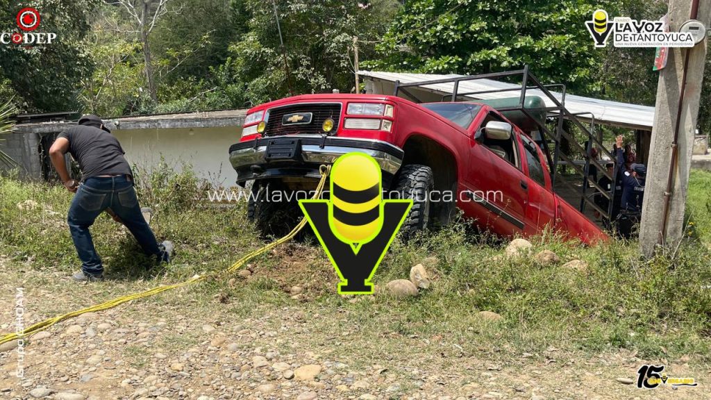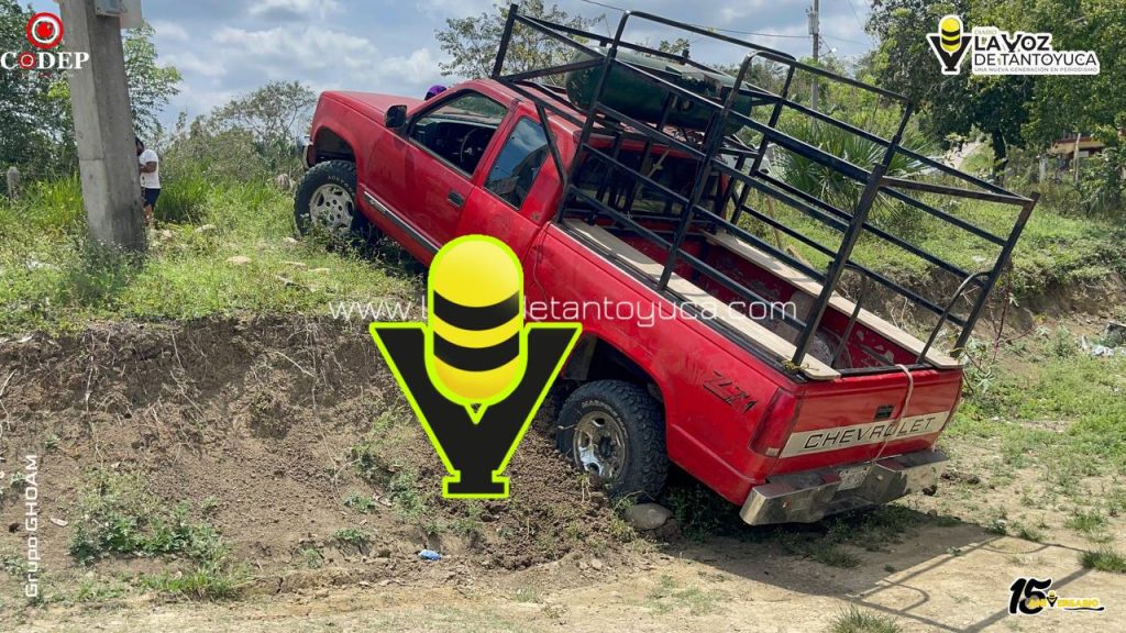 La camioneta, de color rojo, tipo Chevrolet, terminó en una posición riesgosa, lo que evidenció que el percance pudo haber tenido mayores consecuencias; sin embargo, no se reportaron personas lesionadas.