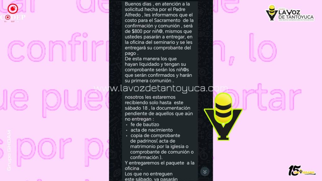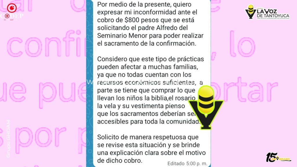 La situación ha encendido el malestar, principalmente entre quienes tienen dos o más hijos en proceso de formación religiosa, ya que el gasto total se multiplica al incluir otros compromisos como la vestimenta, las ofrendas y los costos de la celebración. Padres de familia señalaron que la notificación del nuevo monto se realizó mediante un mensaje enviado por una aplicación de mensajería instantánea.