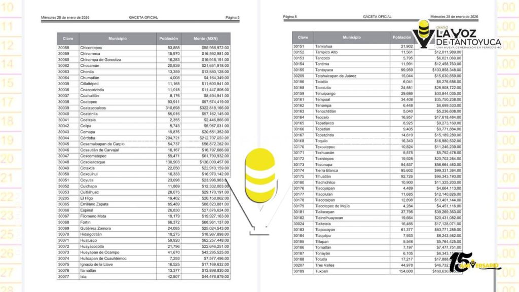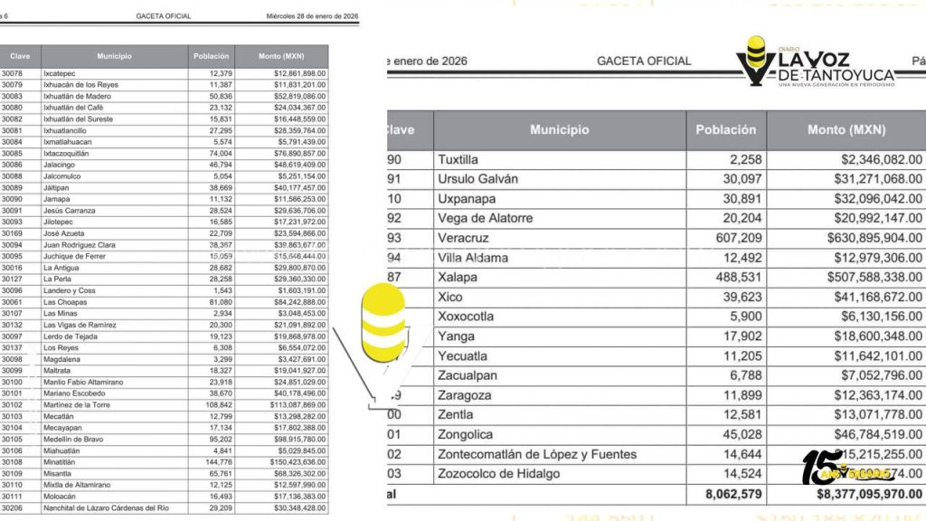 En la publicación oficial también se dieron a conocer los montos asignados a cada uno de los 212 municipios, así como la cifra global correspondiente al ejercicio fiscal 2026, la cual supera los 8 mil millones de pesos.