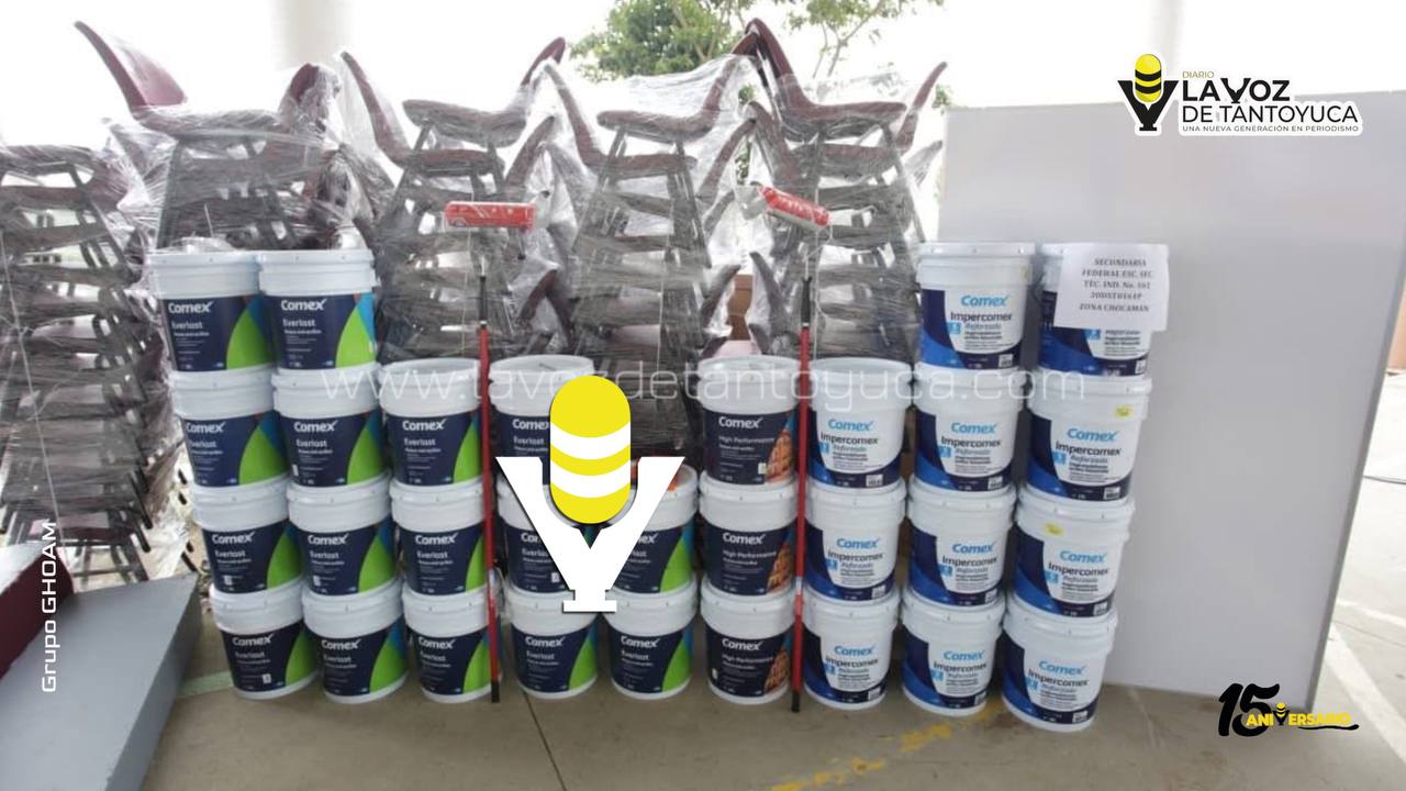 La entrega incluyó mil 245 cubetas de pintura, 950 de impermeabilizante, 3 mil 948 sillas para mesa trapezoidal, mil 974 mesas trapezoidales, 340 pizarrones y 61 pantallas, destinados a 62 primarias, 10 secundarias federales y 16 telesecundarias.