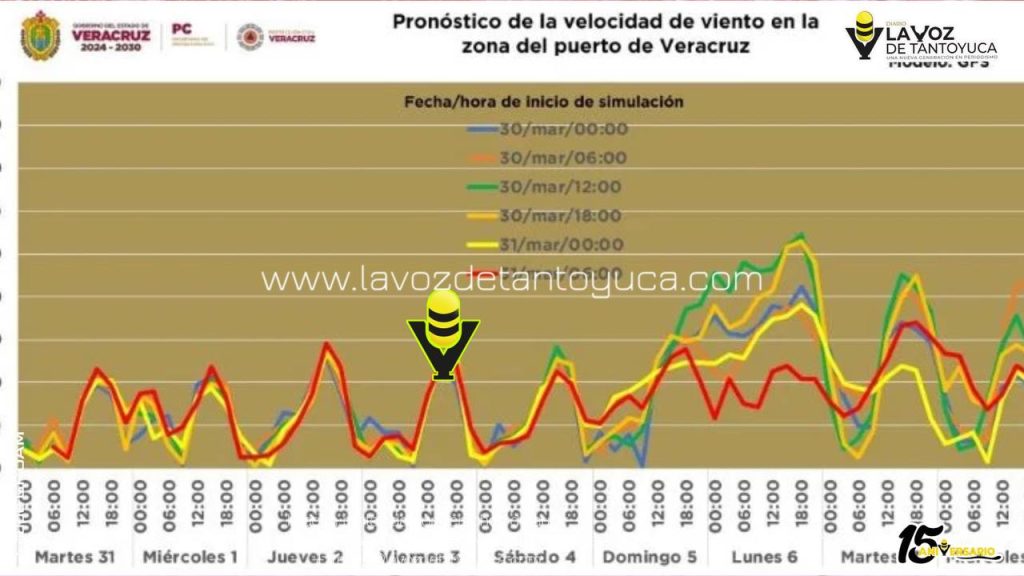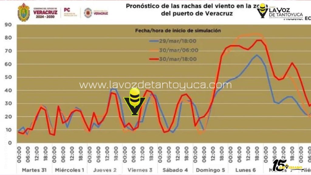 Sobre la proyección del comportamiento del viento, los modelos publicados por Protección Civil indican un aumento de las rachas para el día domingo 5 de abril, lo que coincide con el pronóstico de la entrada del frente frío.