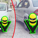 El taxi, de la línea Nissan, Tsuru, marcado con el número económico 768 prácticamente terminó arriba del neumático de la moto tras el impacto.