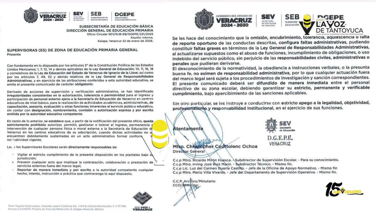 La Secretaría de Educación de Veracruz (SEV), a través de la Subsecretaría de Educación Básica y la Dirección General de Educación Primaria Estatal (DGEPE), emitió un oficio de carácter obligatorio en el que prohíbe estrictamente el ingreso, permanencia o intervención de personal externo en escuelas de educación básica que no cuente con autorización expresa y por escrito de la autoridad educativa competente.