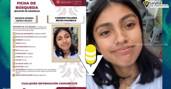 Huautla, Hidalgo | 02 de Diciembre del 2025 | Grupo GHOAM a Comisión de Búsqueda de Personas del Estado de Hidalgo (CBPEH), solicita el apoyo de la población en general para localizar a la joven Carmen Paloma Reyes Pacheco, de 18 años de edad, quien se encuentra en calidad de desaparecida. Esta persona del sexo ... -